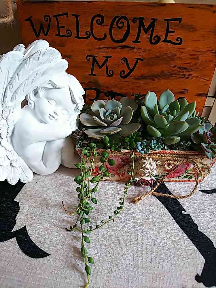 おはようございます⛅可愛い寄せ植えとエンジェルのコラボ😍💓真っ白も美しくて良いかと〜😉💖