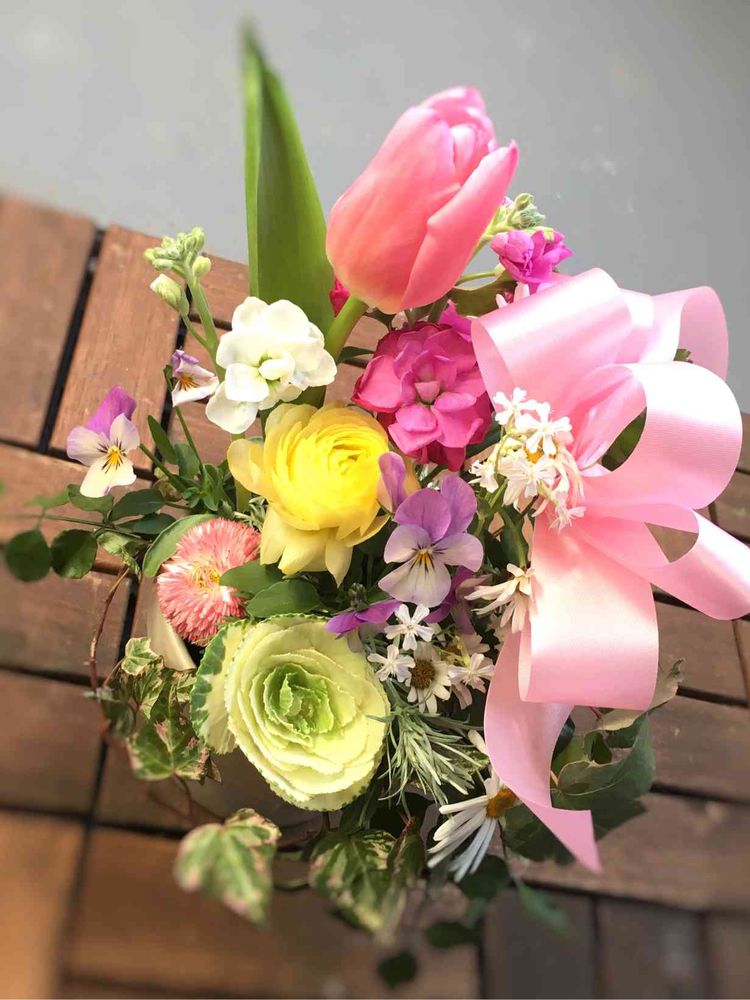 雪に負けちゃったラナン、デージー、ビオラと部屋に飾ってあったお花を使って春色アレンジ。