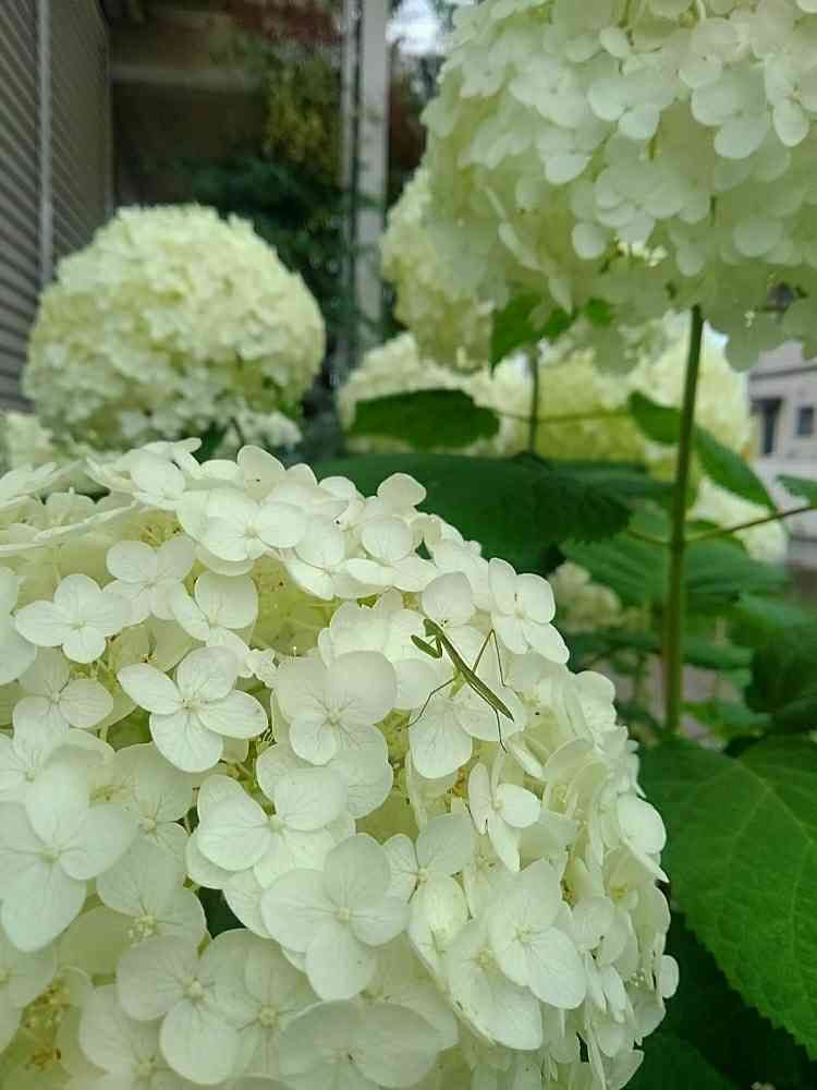 アナベルの花の上はカマキリの子供たちのハンティングホットスポットです(ˊᗜˋ)