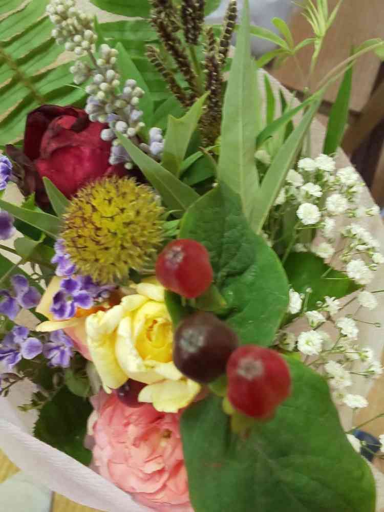 お誕生日会の花束を皆の家から持ちより、作りました。私のはデュランタ宝塚とオリズルランの子でした。切り花が少ないので今度は沢山植えとこ‼️