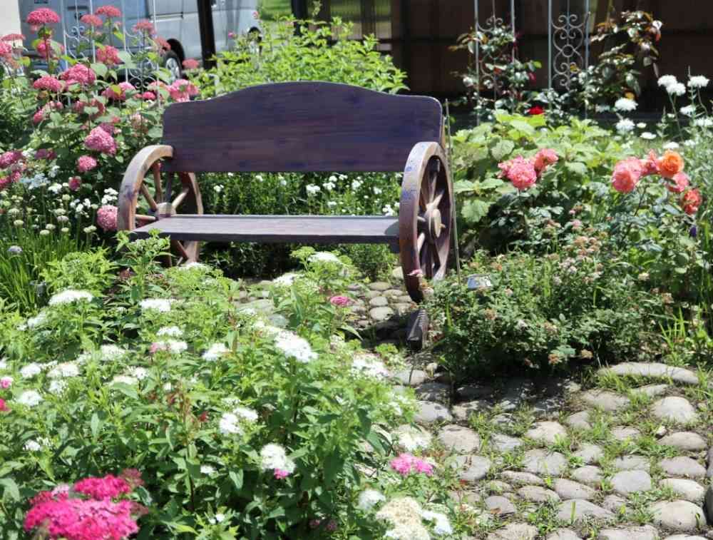 素敵な石畳や車輪のベンチにまたさらに素敵な花たち🌼
