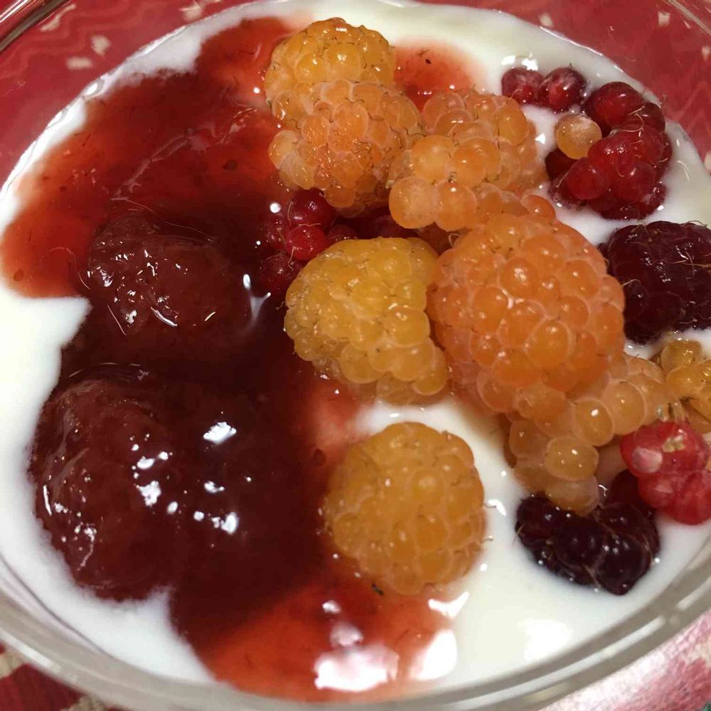 初採りの黄色ラズベリーと赤いラズベリーonヨーグルト。