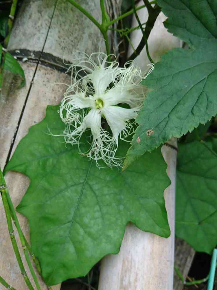 カラスウリが夜に咲くのを知らなかった頃、朝に咲いているのを見て、元気の無い花だなぁと思っていました。