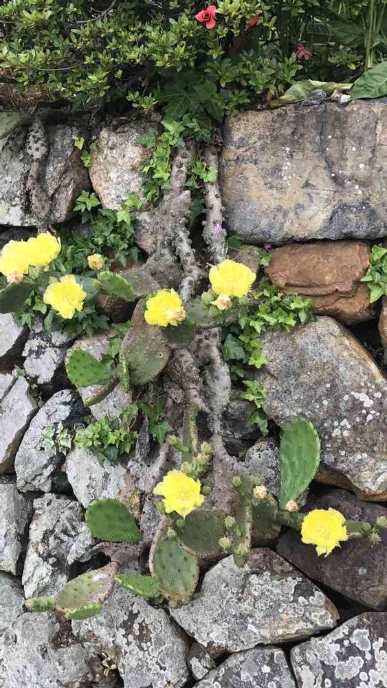 ウチの近所を車で走っていたら、民家の石垣に黄色い花が咲き乱れているのが目に入りました。この時期マツバギクのピンクはそこら中にあるのですが、黄色い花はあまりないので、もしやと思い引き返してみるとかなり年季の入ったウチワサボテンでした。主幹はもはや樹木のようで、大輪の花をたくさんつけていました。
