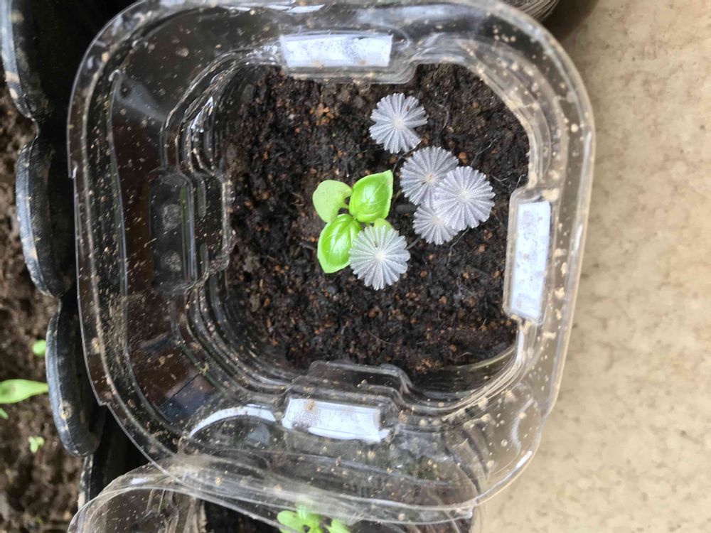 培養土入りのペットボトルに移植したバジルの芽の側に咲いてました。透明感のある白い植物で葉がありません。