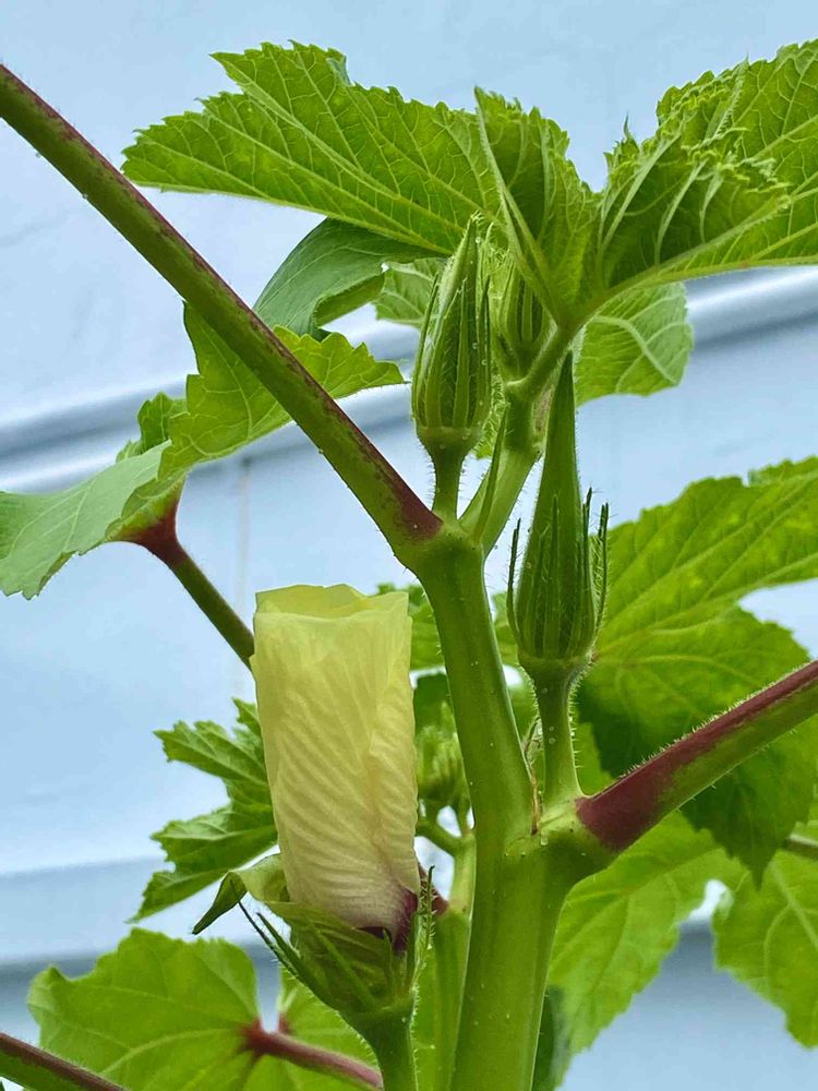今日には花殻の帽子を脱いで~オクラの赤ちゃんお目見得かな( 灬˙罒˙灬 )