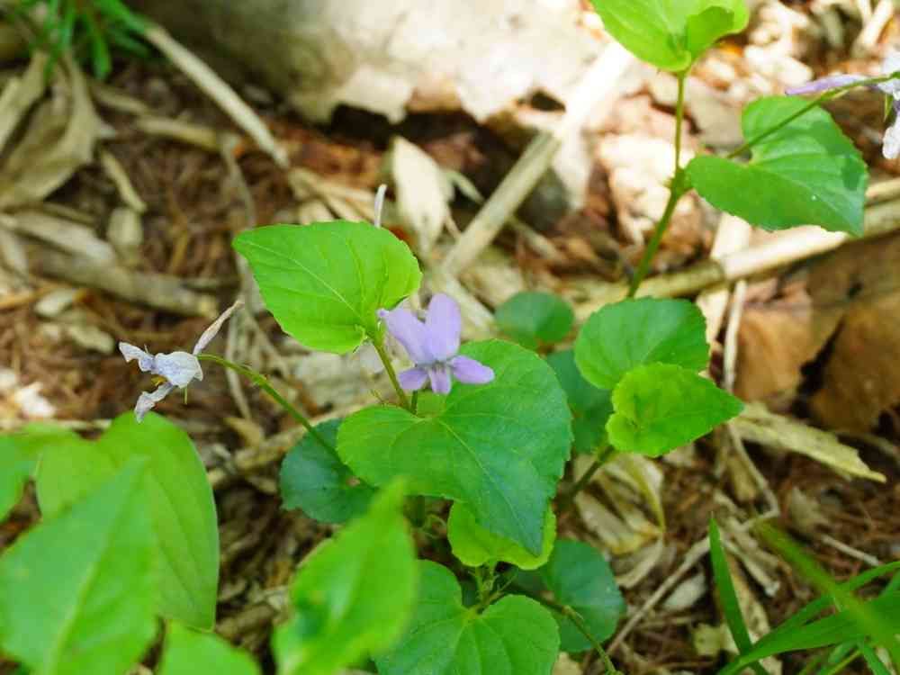 スミレの種類だと思われます。スミレの種類は多く、判断に迷います。葉っぱの形状がはハートに見えるので、ツボスミレ、タチツボスミレに似たような感じです。名前から検索して確認して下さい。