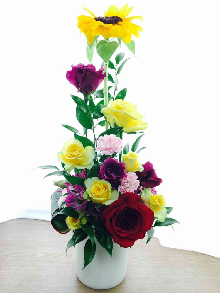 定番のひまわりとバラをメインに近くの花屋に売ってる花材で作りました!