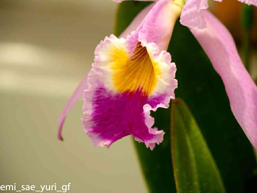 7月2日に神代植物公園に行って来ました。温室内の蘭スペースでカトレアの一種のヒノデランという種類みたいです。細長い花びらの先を望遠でズームアップして撮りました。紫と黄色のバランスが綺麗です。