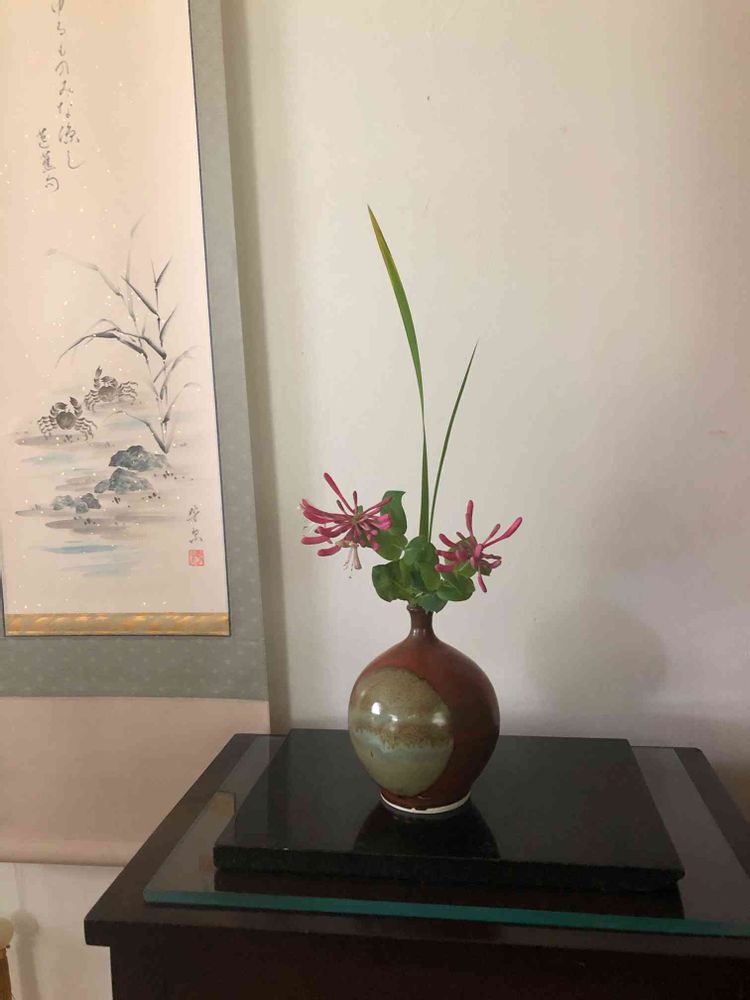 クリムゾンハニーサックルとアイリスの葉を使っています。花器はJack Troy さんの作品です。