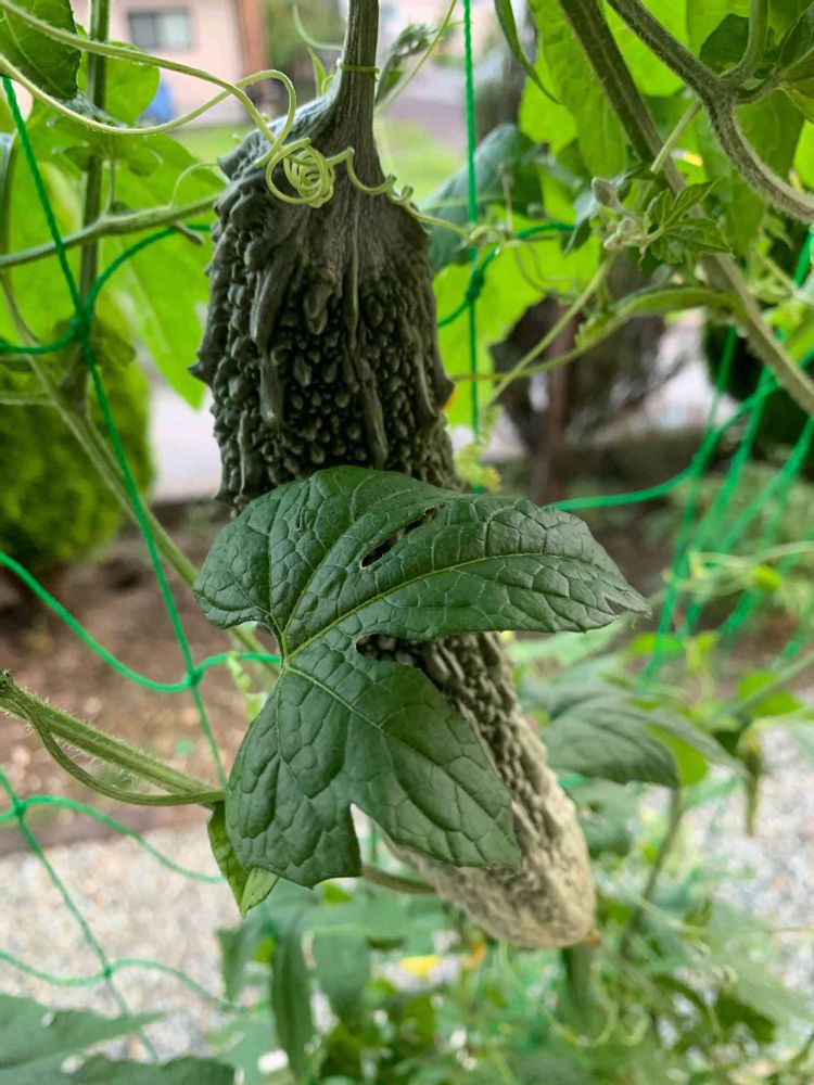 ゴーヤは熟す前に収穫しないと黄色くなります。開花してから20日くらいが収穫のタイミングだそうです。