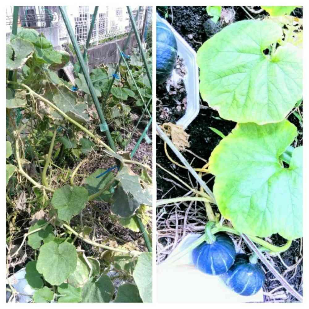 赤ちゃんカボチャ、左、雨☔風で無惨に…でも15個も成っていた。何個食べれるか解らないけど…