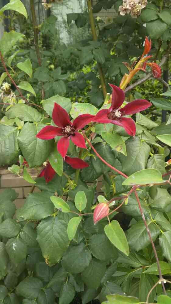クレマチス(クレイプダイビューティー)。クレマチスの花はラベルの色と発色が違うことが多いですが、これは珍しく思い通りの色でした😃ナエマの新芽が伸びています。
