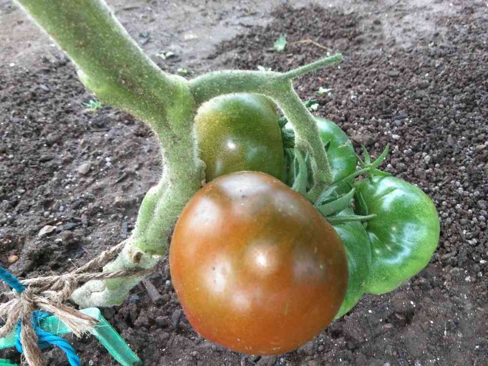 中玉トマトです。やっとここまで色付きました❗ が、色付き方がとなりに植わってるミニトマトの赤とは違うように感じます。もしかして、ブラックチェリーの中玉でしょうかねえ(; ̄ー ̄A 楽しみです!( ̄▽ ̄;)