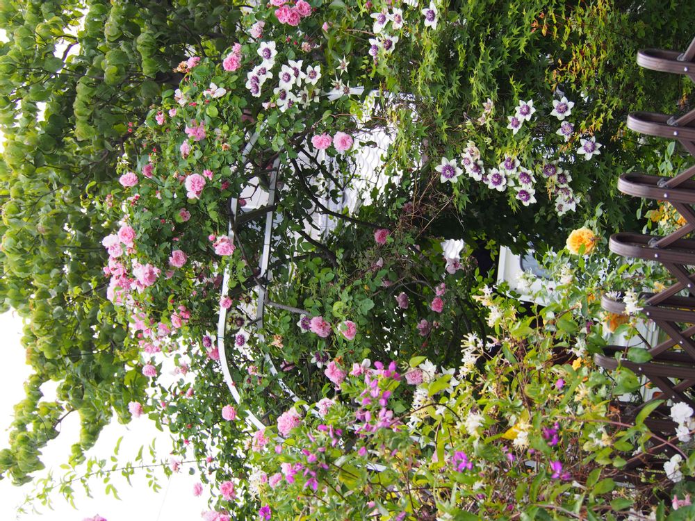 薔薇とクレマチスにスイカズラの甘い甘い香りがミックスして、いつまでも庭でいたくなりますよ。