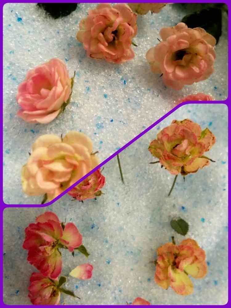 ミニバラ「リトルウッズ」🌹をドライフラワー用シリカゲルで乾燥させてみましたが、小さな花びらがポロポロしてしまって、とても脆い感じ😣