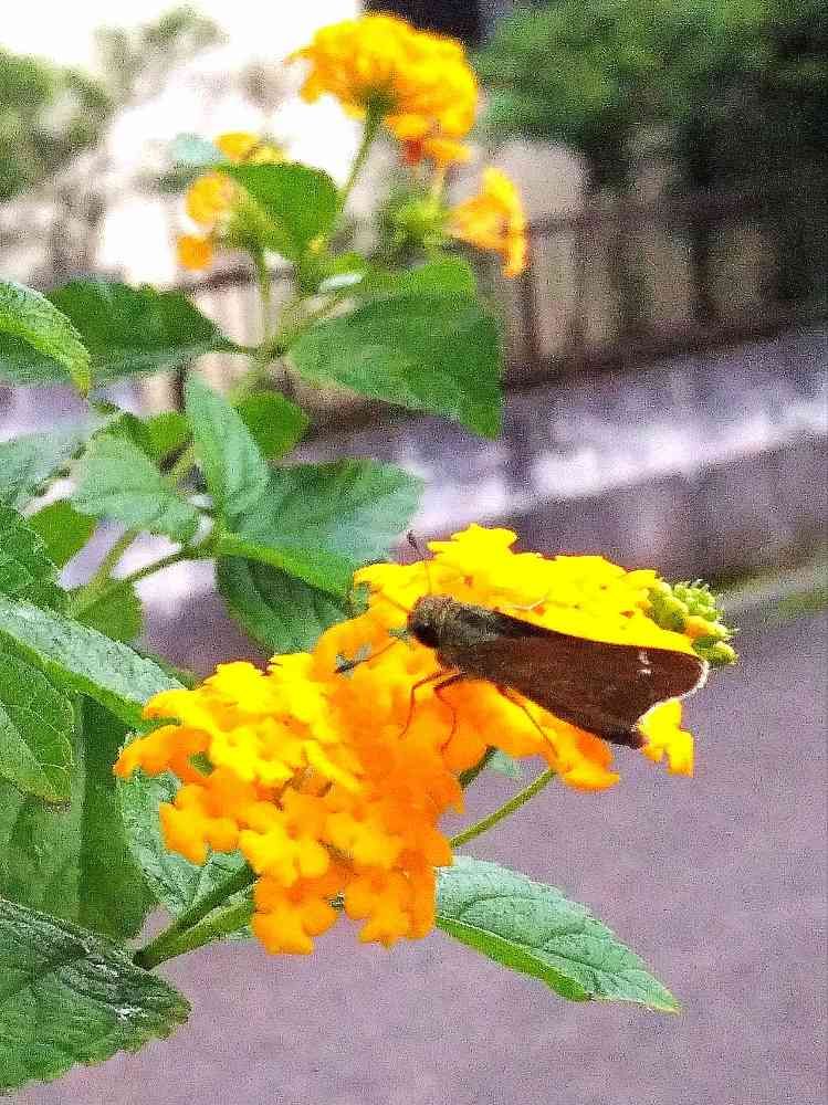 冬越しのランタナが咲いてくれて嬉しくて、霧雨の中で撮りましたが、撮ってるところに蝶々さんが来てくれて、焦ってピントが今ひとつ💦