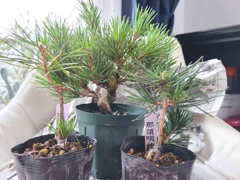 デカめの黒松と那須五葉松の接ぎ木2種😊那須五葉は接ぎ木1年生でまだ台木がついてるw