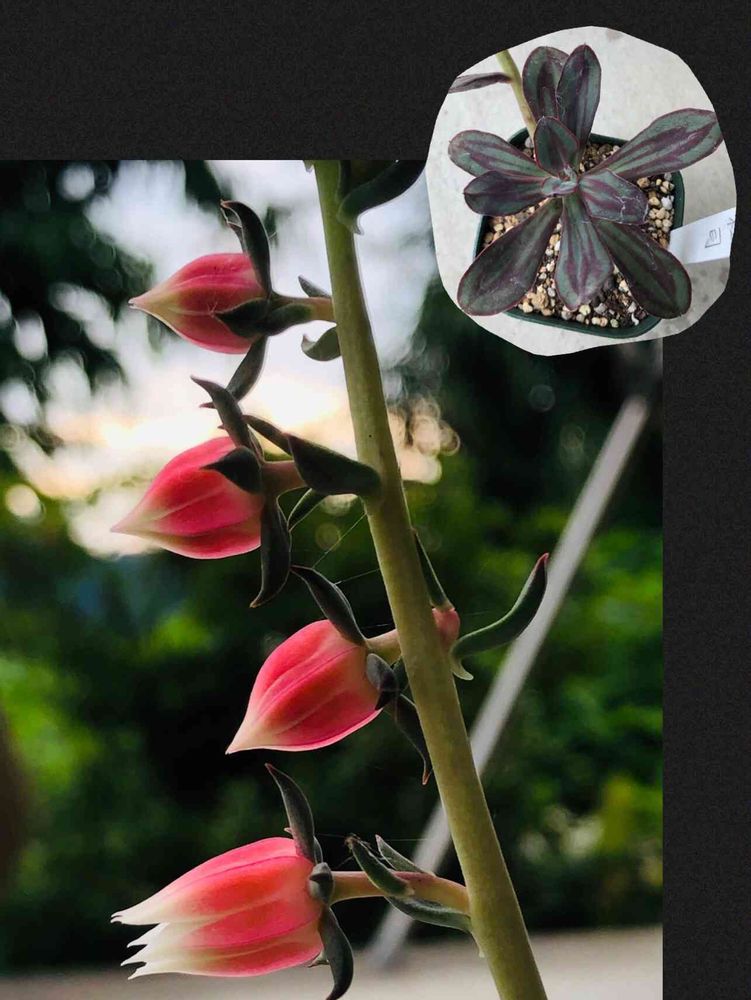 花びらの先が白いエケベリアの花芽を初めて見ました。日照が足りないから白いかも?は否定はできませんが、珍しいのと、葉とのギャップでキュン度up⤴︎⤴︎