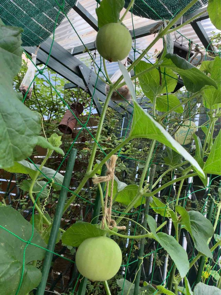空中メロン🍈昔はメロンは地面を這うものと思ってましたが空中でも十分にぶら下がるんですね😄でもそろそろ重そうなので虫除け、ナメクジよけも含めてネットをかけてあげます♫無事に大きくなりますように