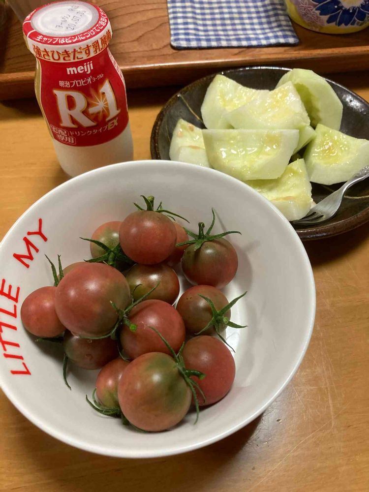 プランターから収穫した黒紫ミニトマト、畑の菊メロンで朝食でした。