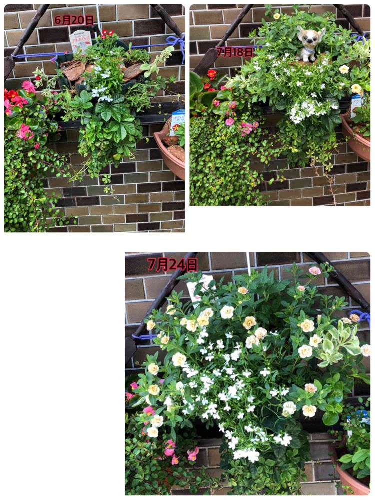 6月から形作ったハンギングが、そろそろ咲き揃って枝も伸びて、土も見えなくなって完成形となりました。