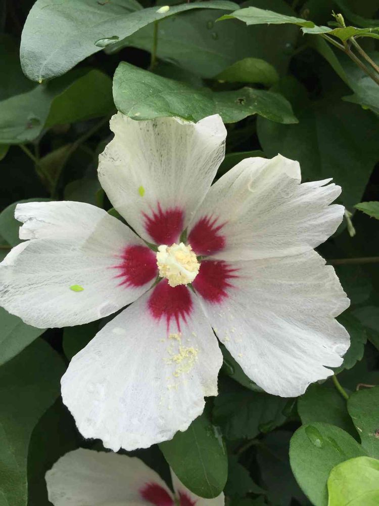 梅雨空、時々、小雨の降る中でムクゲが生き生き