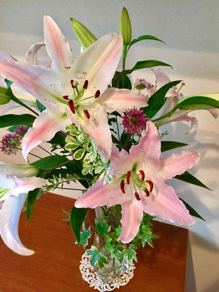 うちにある植物ばかりで飾ってみました。ピンクカサブランカはゴージャスです。