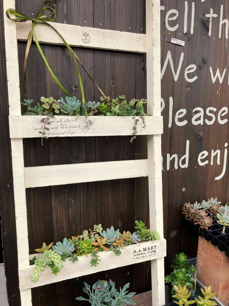 お返事が遅くなりました🙇♀️このラダープランターはお店でディスプレイされてたものです💕素敵ですよね❤️多肉ごと売ってたんですがちょっとお高くて買えず💦3000円以上したと思います😂自分でもなんとか作れそうと思って参考に写真に残しました😆
