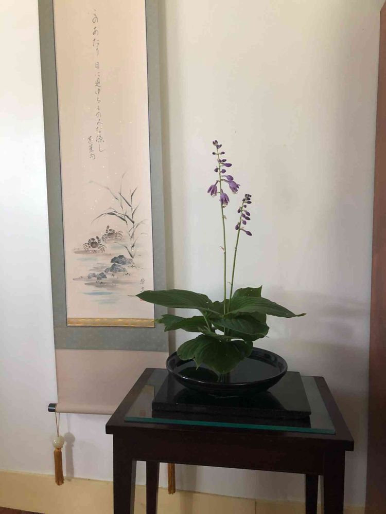ギボウシです。出始めには食べられるし、長い間葉っぱは緑を保ってお庭で頑張ってくれるし、こうして地味ながらお花のお稽古にも使えます。葉も班入りやライムグリーンや細いのや丸いのやバリエーションも豊富です。数種類庭にあるとありがたいです。