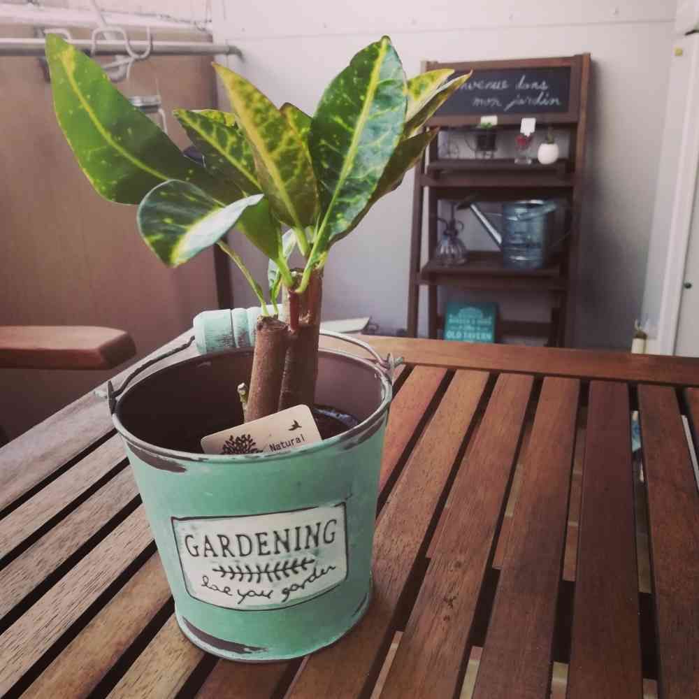 3日前に仲間入りした観葉植物、クロトンちゃんです。葉っぱのカラーと木の幹に惹かれて、ナチュラルキッチンからお持ち帰りしました♪セリアのミニバケツに入れて飾っています☆