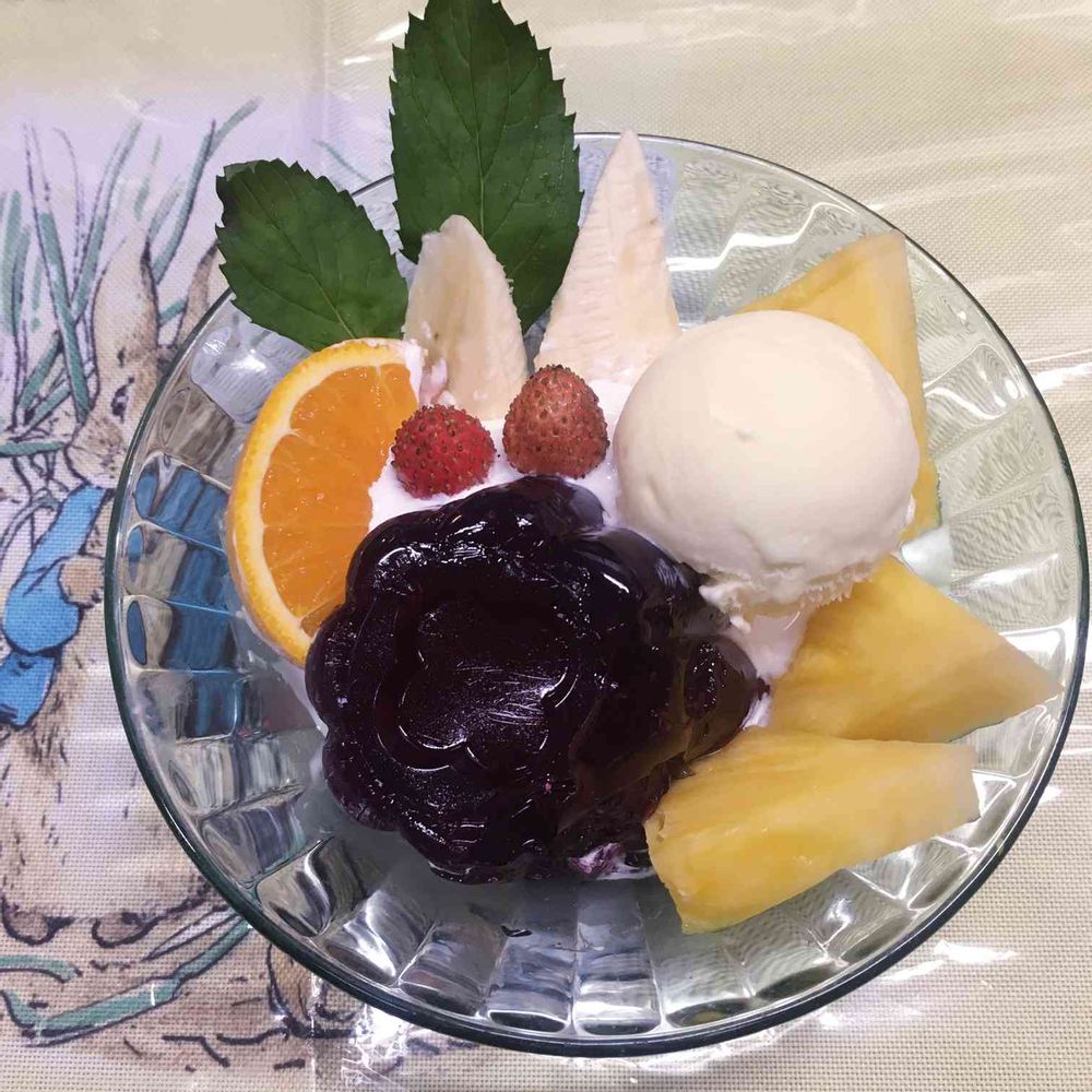 赤紫蘇ゼリー、赤花苺、バナナ、パイナップル、オレンジのパフェスペアミント添え。