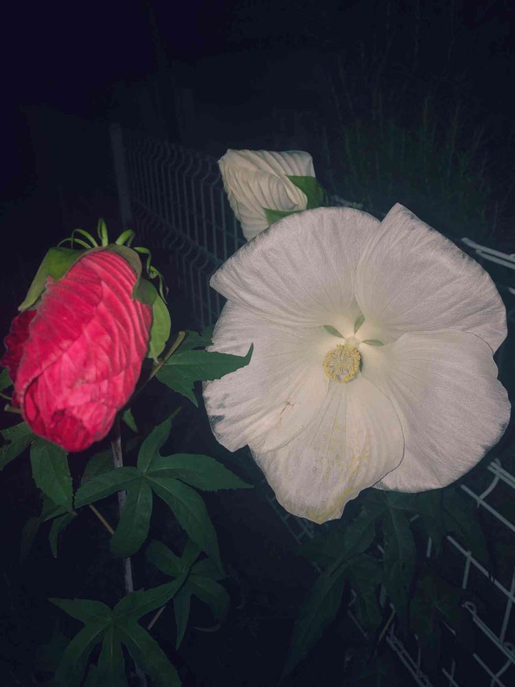 今日は仕事が遅くなり、暗がりの中、タイタンビスカスを見たらなんと、エルフちゃんがもう一輪、フレアちゃんも一輪咲こうとしてました。