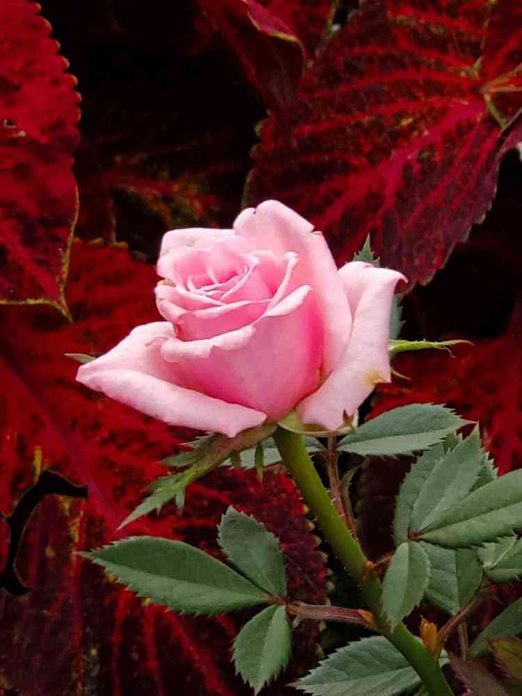 幻想的な華やぎを見せるコリウスの華やぎを背景にして、清々しい雰囲気を見せて咲き誇るミニバラの輝き、素敵です