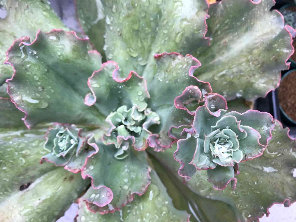 今年鉢増しした途端に巨大化した高砂の翁さんです。気がつくとロゼットが3つに増えてる…