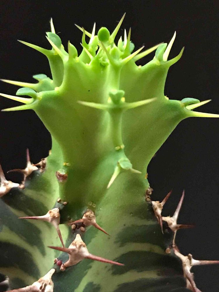 ユーフォルビアが新たな形状に進化している。拡大して撮ったら、こんな小さな芽が出ていた。教会の天井絵の天使の様に見える。自然の芸術。