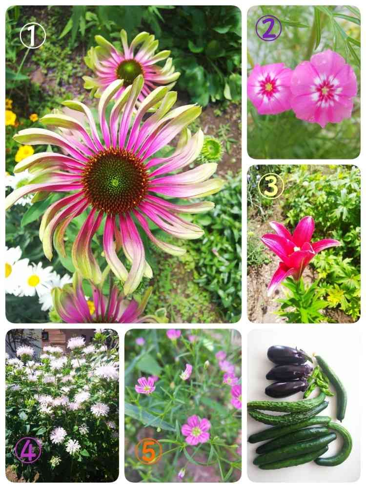 ①先日投稿したエキナセアがこうなりました🌼お化粧が濃くなった(?()感じ😅②野原の種から久々に新しいお花🌼何のお花だろう🤭③うちには珍しい普段なら選ばない鉄砲百合🌼なぜあるか🤔安かったから🤣④モナルダ満開⑤これも野原の種から咲いたのかなぁ❔カスミソウの一種❔⑥収穫~🥒🍆あれ?「⑥」つけるの忘れてる💦