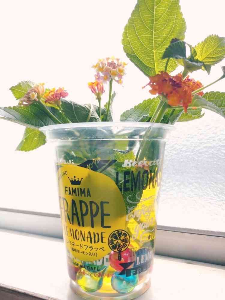 ファミマの『レモネードフラッペ』の入れ物にビー玉を入れて生けてみました。