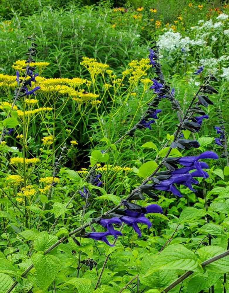 オミナエシの黄花と濃い紺色のお花サルビアガラニチカ、ハツユキソウの白綺麗なコントラストです。