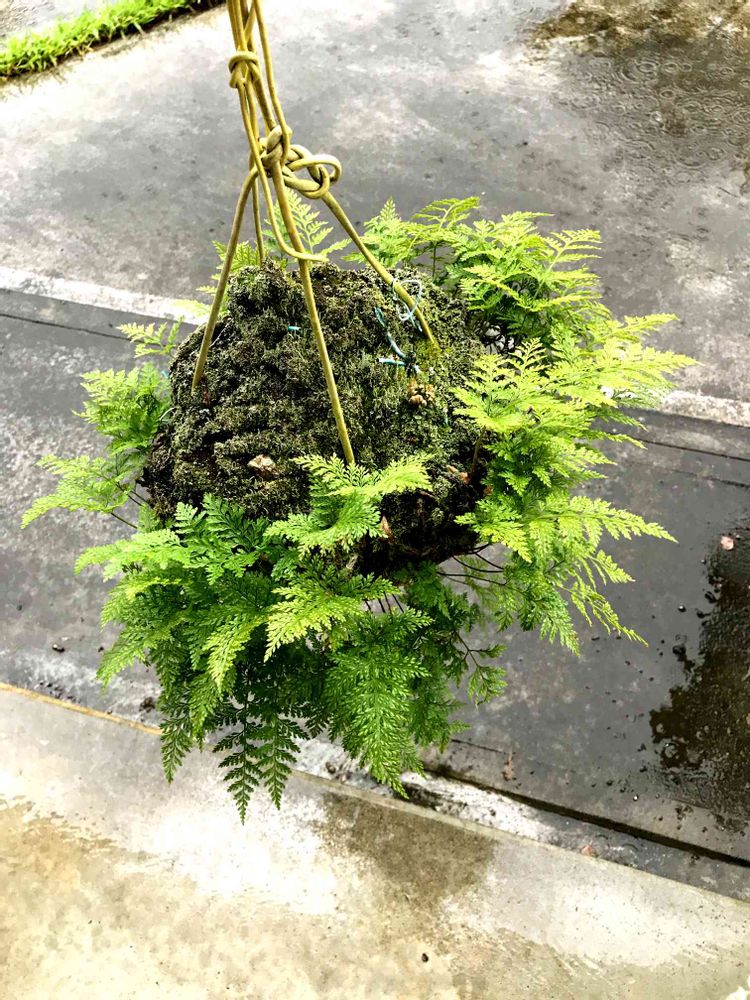 釣りしのぶは、井桁に、組んだ木組みの中に水ゴケで、包んだしのぶを吊るしたもので、苔玉は、ケト土で、シノブを巻いて苔やミズゴケで、丸くしたものですね。合ってあると思うけど、、、🤔