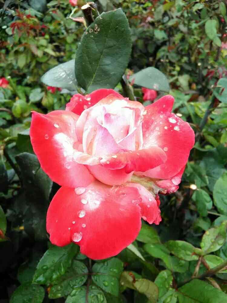 つぼみは赤く🌹、咲き進むと花弁の端の赤色が濃く広がっていくみたいです。バラさんの名前は雰囲気が丹頂鶴に似てるところからきてるみたいです。雨に濡れてることもあり、とても輝いてました✨