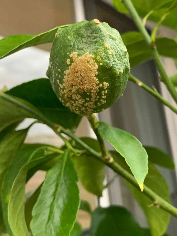 カイガラ虫の被害と思われます、レモンに着いているのは丁寧に手(軍手や手袋🧤などで)皮を出来るだけ丁寧に取り除きます。他に幹や葉っぱの表と裏、細い幹や枝の隅々まで点検をする事をお勧めします、カイガラ虫は色々な種類がいますので形も違いがあるので幹や枝には同じ色をしたカイガラ虫もいます。全部取り除いた後はカイガラ虫退治の殺虫剤を散布してください、先に散布してもカイガラ虫はカイガラをまとった虫と言われるほどなので手で取り薬がいいと思います。