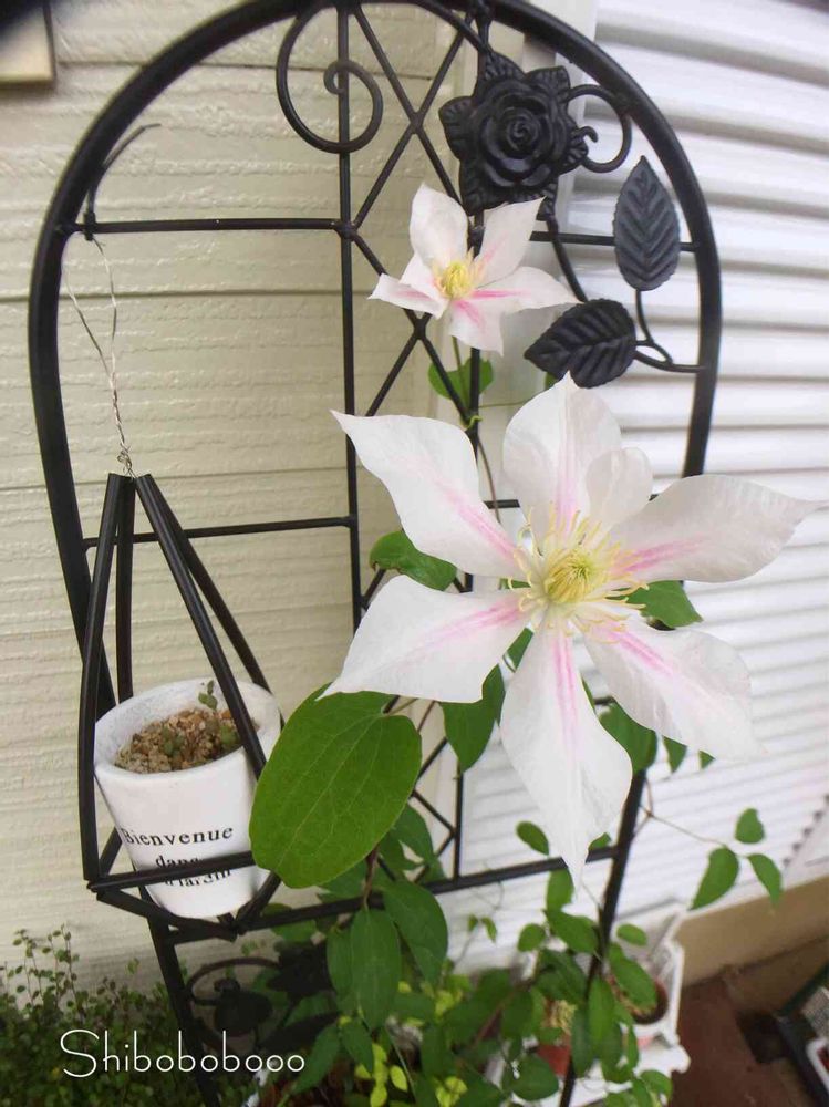 ゴールデンウィークにクレマチスの丘で買ったアンドロメダという名の湘南クレマチス🌸咲きました♪ピーチネックレスとコラボ🍑