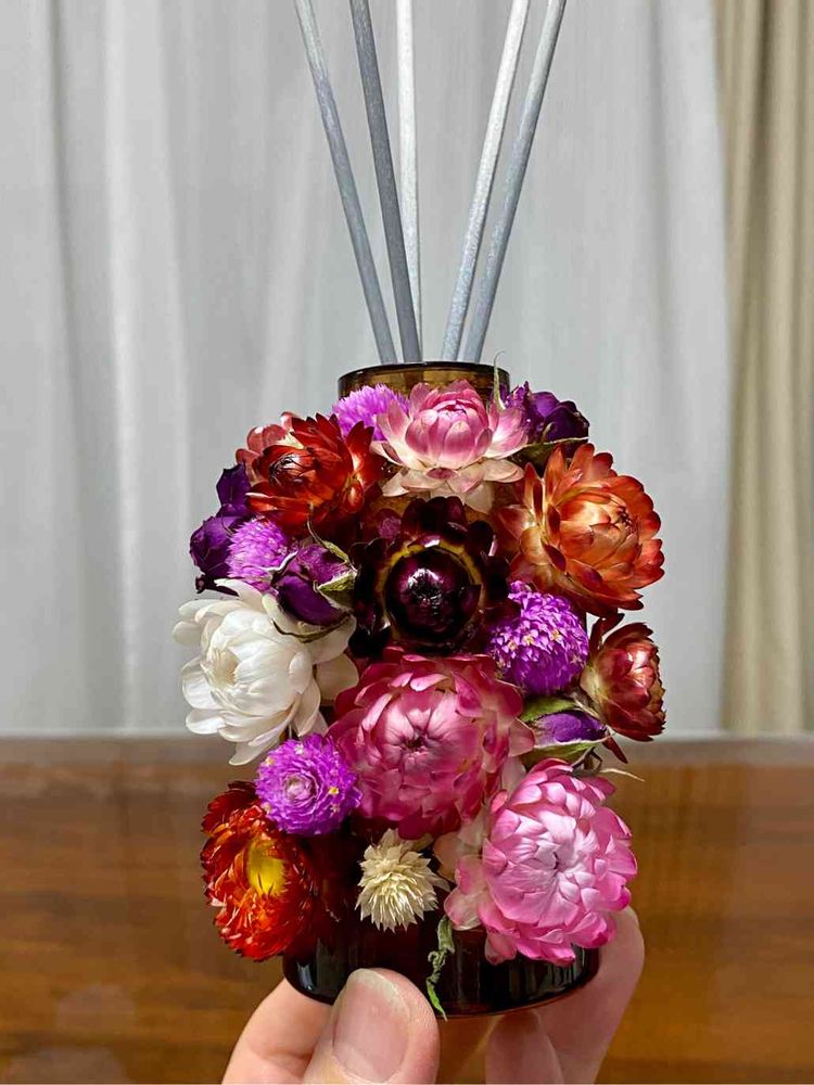 初めまして💕フォローありがとうございます。ヘリクサムと千日紅と薔薇の蕾を使いました。色褪せないステキなお花なんですよ〜💖