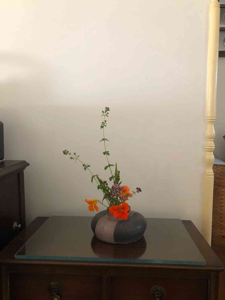 花材はNasturtium(ナスタチウム)、Majoram(マジョラム), barnyard grass(イヌビエ)の穂を中央に入れ、ざっくりいびつな花器にきれいなオレンジを添えてみました。