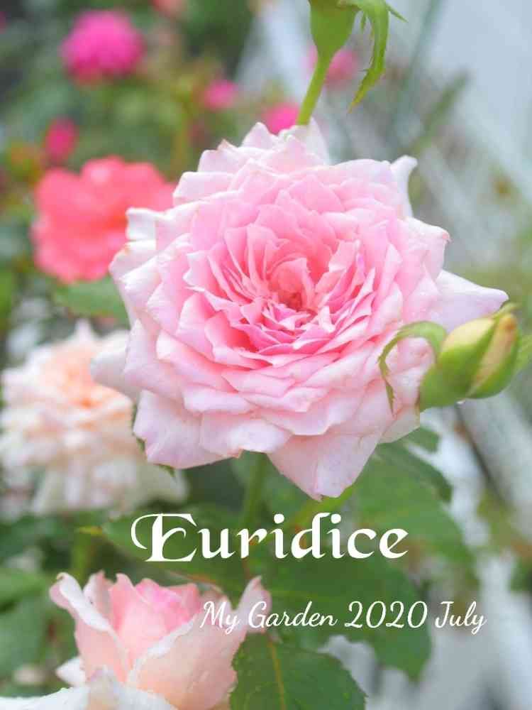 しばらくお休みしていたエウリディーチェがまた咲き始めました。前回結構切り戻したつもりでしたがニョキーっとまっすぐ伸びて結構高い位置で咲いています。直立タイプで1.2mと、ロサオリエンティスのカタログには書いてありますが、もうちょっと背が大きくなる子なイメージですねえ。。