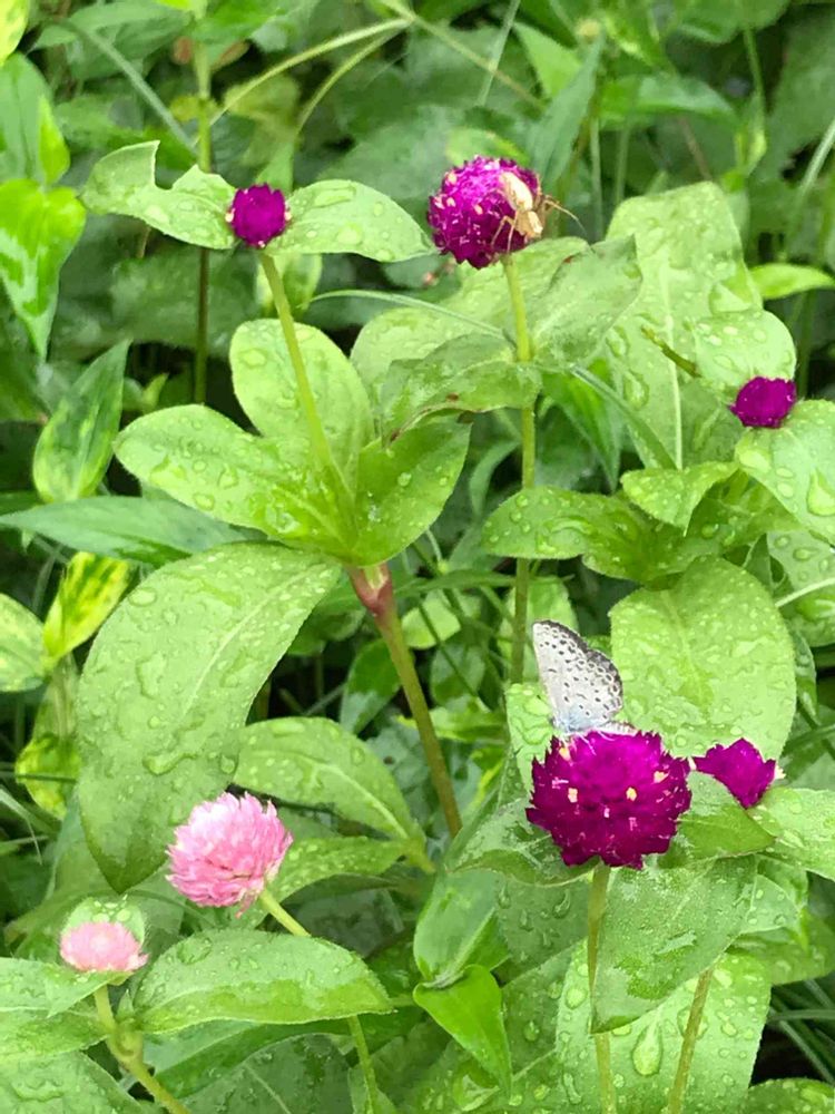雨の中でも忙しく飛び回っているシジミ蝶。千日紅にとまってくれないかなーとずっと待っていた私とクモ。