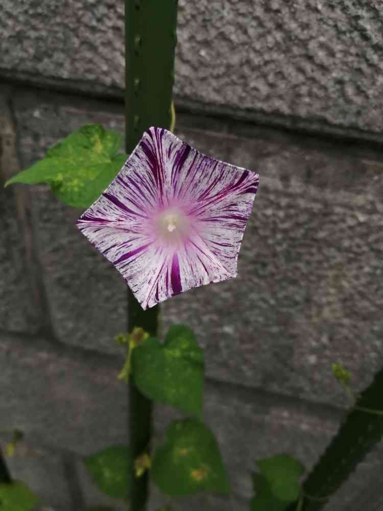 実家の庭です。どこかから飛んで来た種からの朝顔です。シマシマと5角形が可愛い。