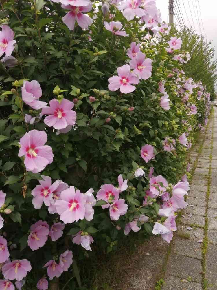 歩道に咲くムクゲさん達です。夏ですね~(^_^)