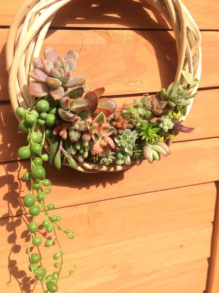 水苔の中に培養土を網で寿司巻みたいにしたやつをワイヤーでリースにとめてます。カット苗はネットやヤフオクにありますよ~ぜひ作ってみてあるある体験して下さい٩(ˊᗜˋ*)و(笑)